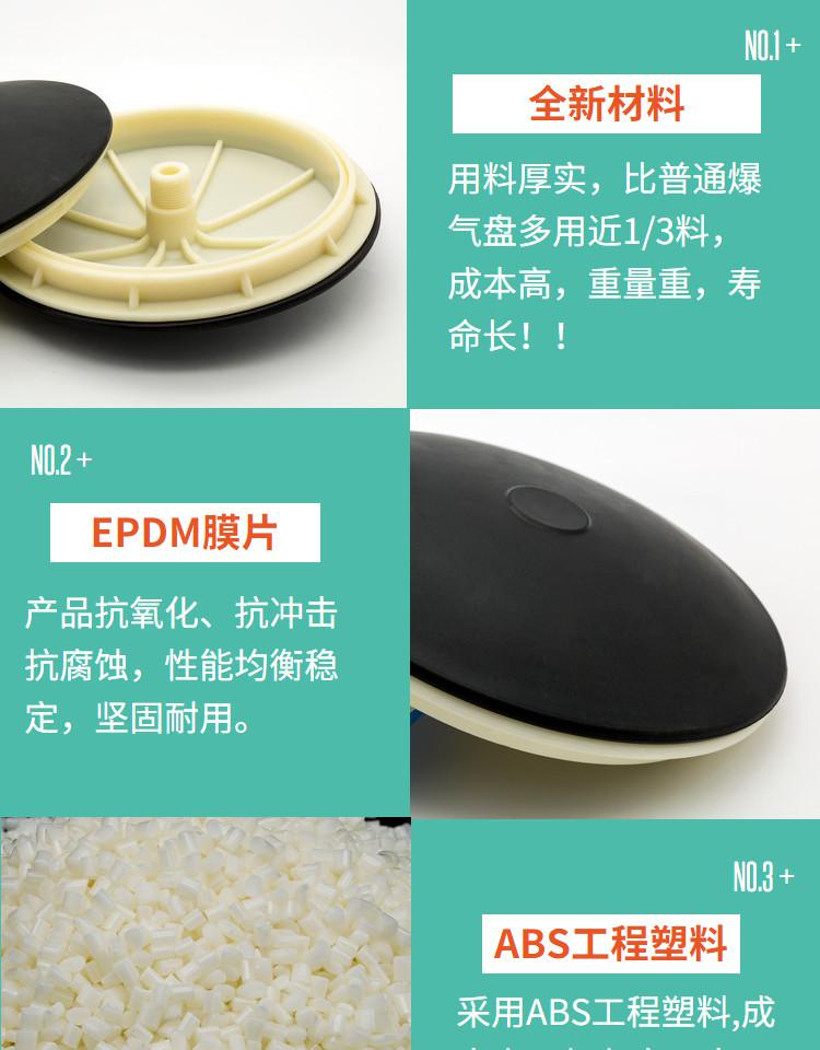 (1)橡膠膜片:選用進(jìn)口優(yōu)質(zhì)橡膠原料,根據(jù)曝氣工況需求量身定制材質(zhì)成分與配比,具有良好的物理、化學(xué)性能,有效防止膜片收縮、硬化與老化,延長(zhǎng)產(chǎn)品壽命。