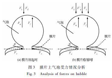 由于曝氣產生的氣泡眾多,以單個氣泡為例,分析其在傳統的連續曝氣和脈沖式曝氣情況下的受力情況,如圖3所示?氣泡在連續曝氣情況下生成過程中受到上升浮力Ff?約束力Fσ?流體對氣泡的粘性力Fd?慣性力Fl?通過小孔的氣體沖量的力Fm 等力的作用,氣泡受力分析如圖3(a)所示?采用脈沖曝氣方式時,膜片在收縮過程中還受到阻力Fz的作用?由于周期性的氣壓,膜片做間歇性的鼓起?收縮,膜片在收縮的某一瞬間過程中氣泡的受力情況如圖3(b)所示?