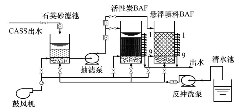 兩套曝氣生物濾池試驗裝置如圖 1所示,該污水處理廠生化處理采用CASS工藝,CASS出水經潛水泵打入前端石英砂濾池,去除懸浮物質以方便準確進行沿程試驗研究,同時減少后續(xù)BAF處理負荷和減緩反沖洗頻率. 再經抽濾泵抽吸,均以15 t ·d-1的流量并聯(lián)流入活性炭BAF和懸浮填料BAF,水力停留時間分別為1 h和2 h,溶解氧均控制在4 mg ·L-1左右. *后經過兩套BAF處理排出. 濾池反沖洗采用“氣沖 (氣沖+水沖) 水漂洗”的方式. 先氣沖10 min,再氣水聯(lián)合沖洗10 min,*后水漂洗5 min的方式. 中試裝置從10月下旬至次年1月中旬連續(xù)通水運行80 d. 運行前30 d視為掛膜啟動階段. 第31 d開始連續(xù)監(jiān)測出水水質,評估BAF沿高程的凈化效果,沿程試驗期間水溫為15~20℃.