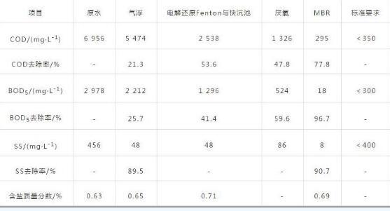 調(diào)試初期,對(duì)電解還原Fenton工藝的反應(yīng)電壓、電流及加藥量進(jìn)行了調(diào)試,對(duì)厭氧池采用接種化糞池污泥進(jìn)行接種,對(duì)MBR裝置采用洞頭區(qū)市政污水處理廠污泥濃縮池的污泥進(jìn)行接種。經(jīng)過(guò)近半年的試運(yùn)行,采用該組合工藝處理該廢水,氣浮池、電解還原Fenton、厭氧及MBR設(shè)計(jì)COD去除率分別為25%、50%、65%、70%。具體進(jìn)、出水水質(zhì)及各工藝段去除率見(jiàn)表2。